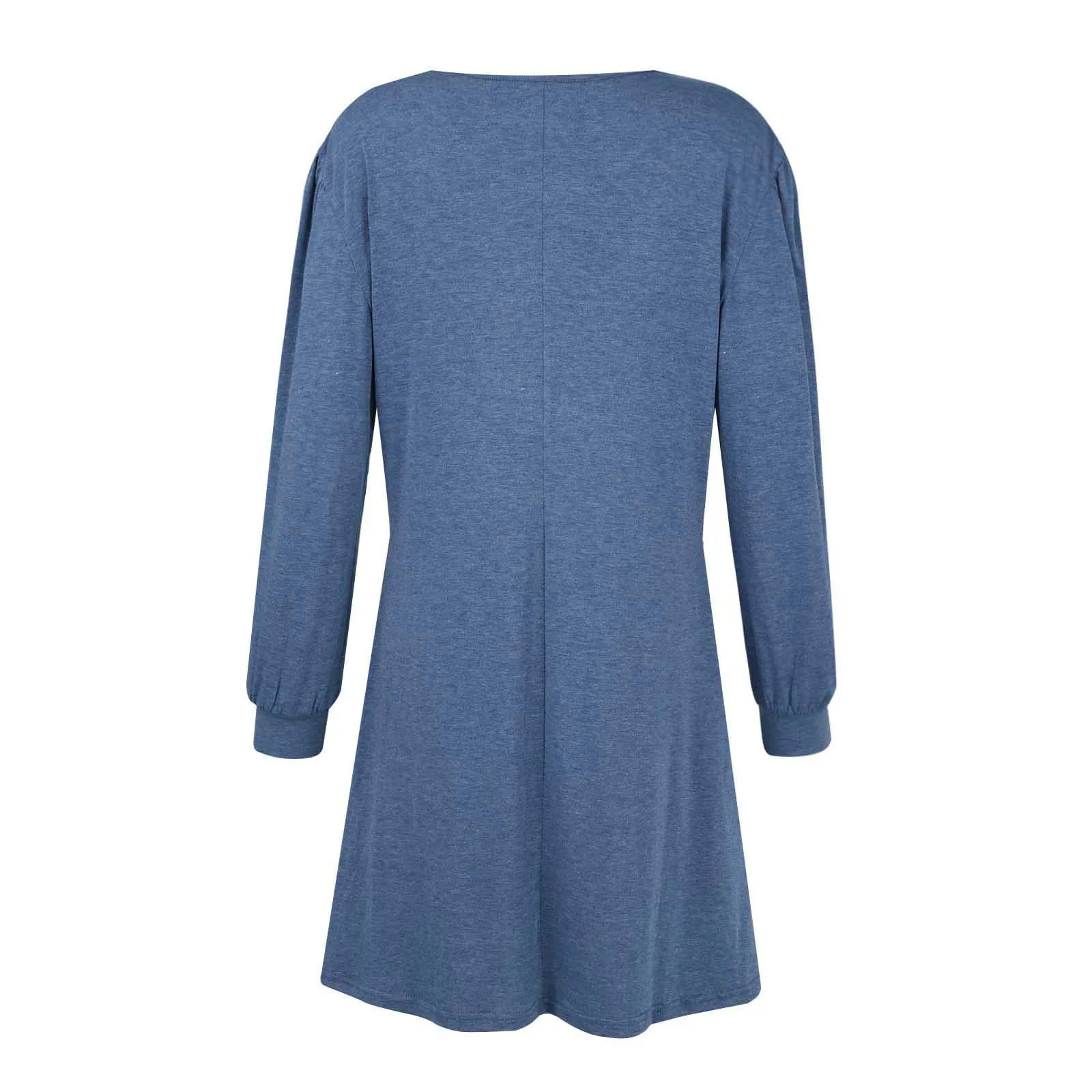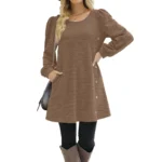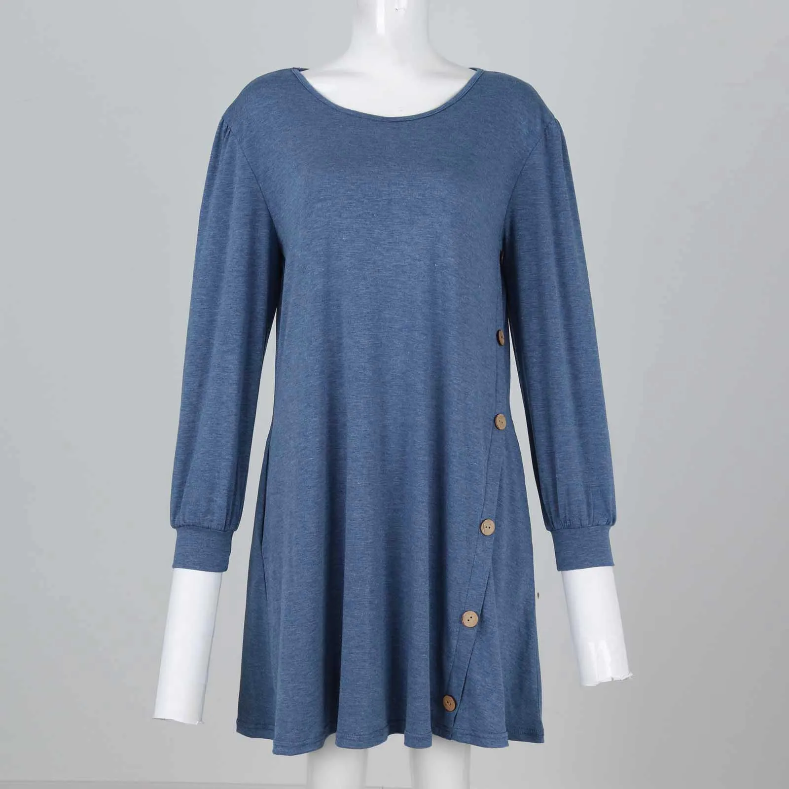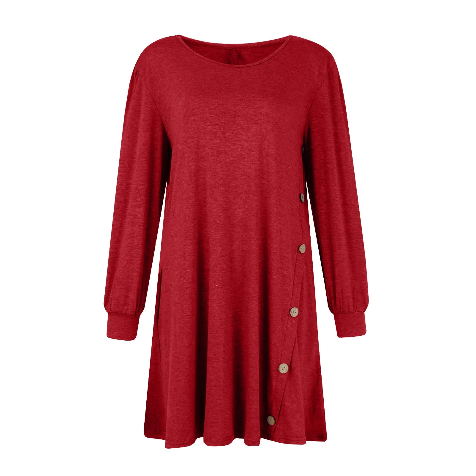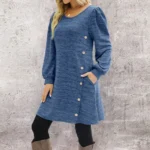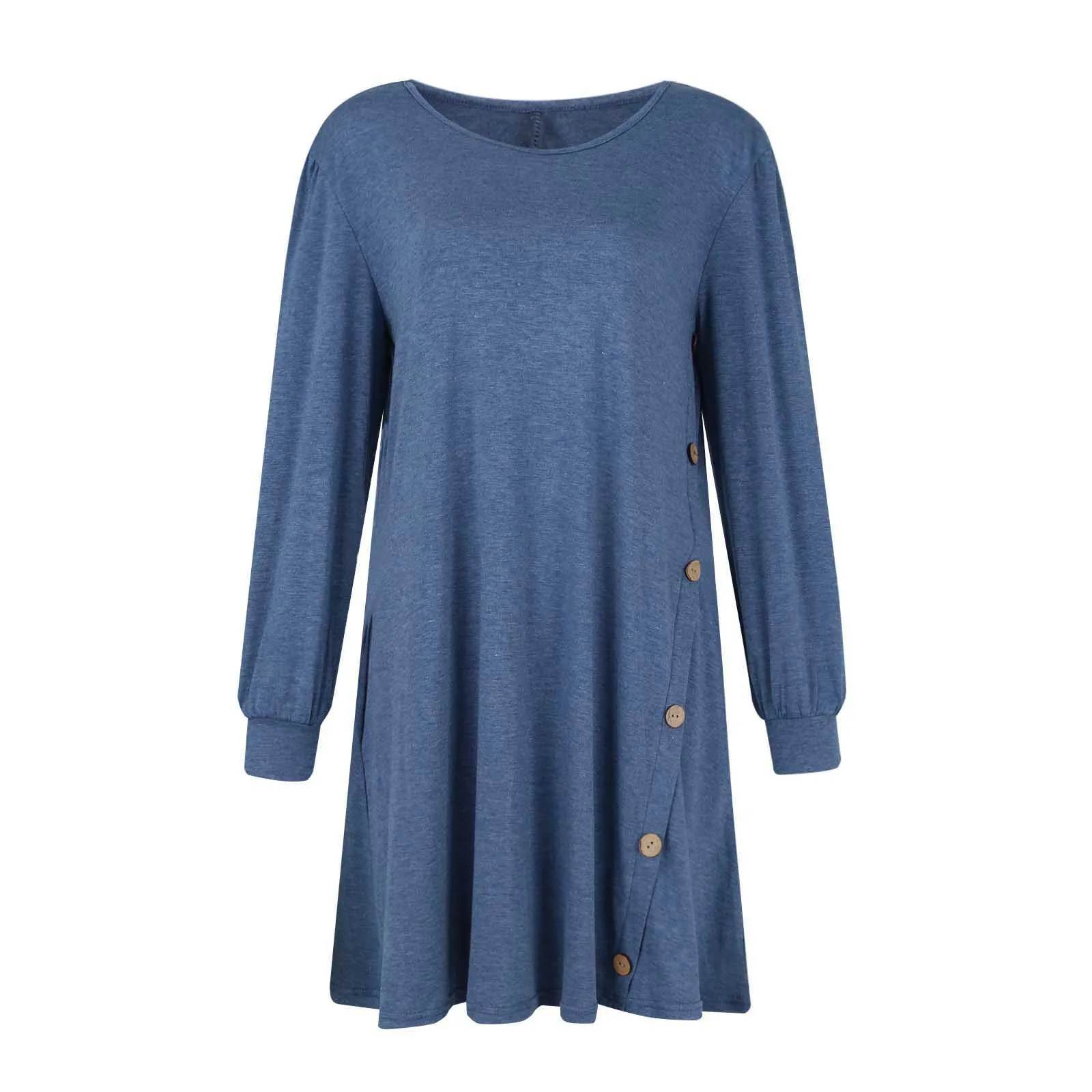 Fashion Women Round Neck Solid Color Button Long Sleeve Casual Loose Dress