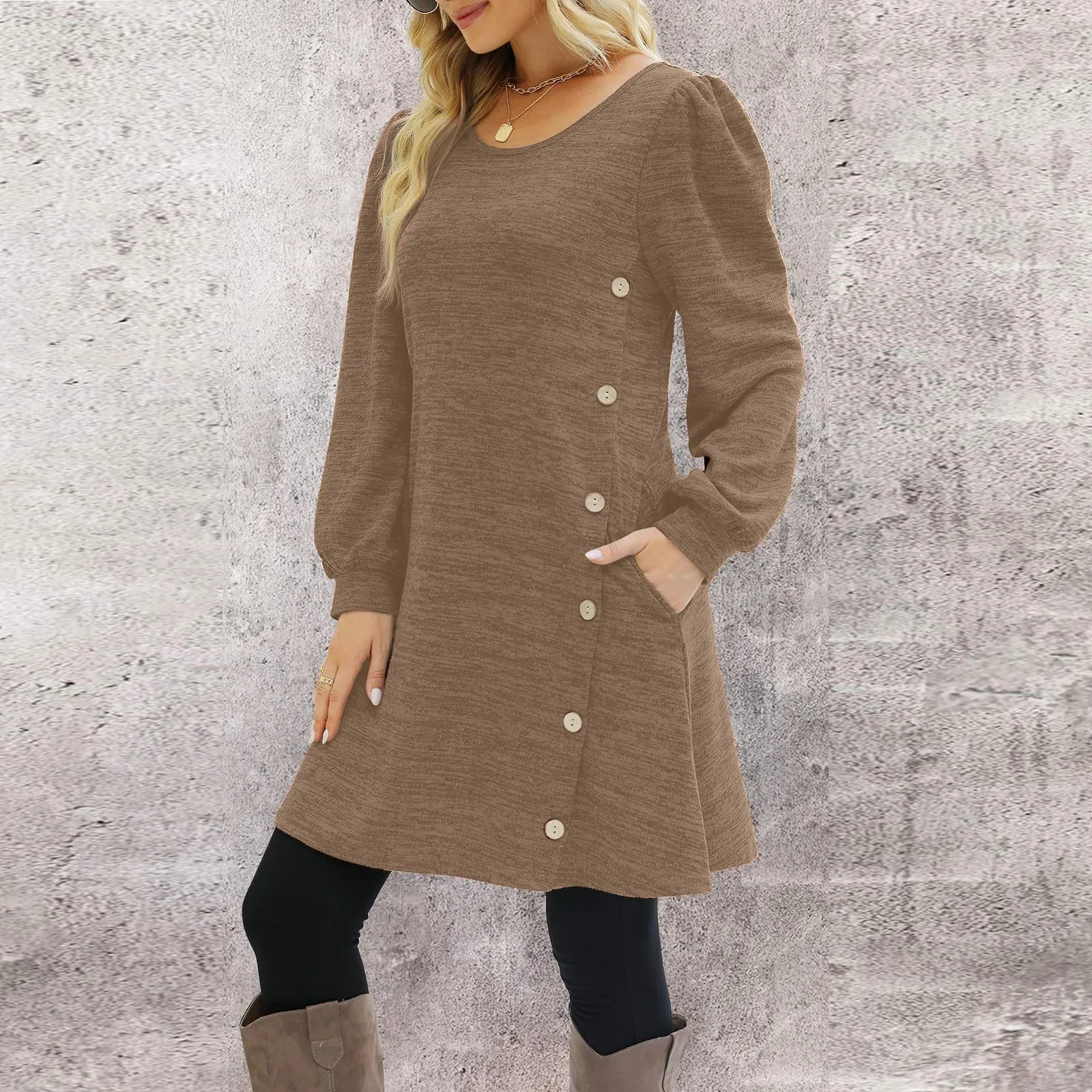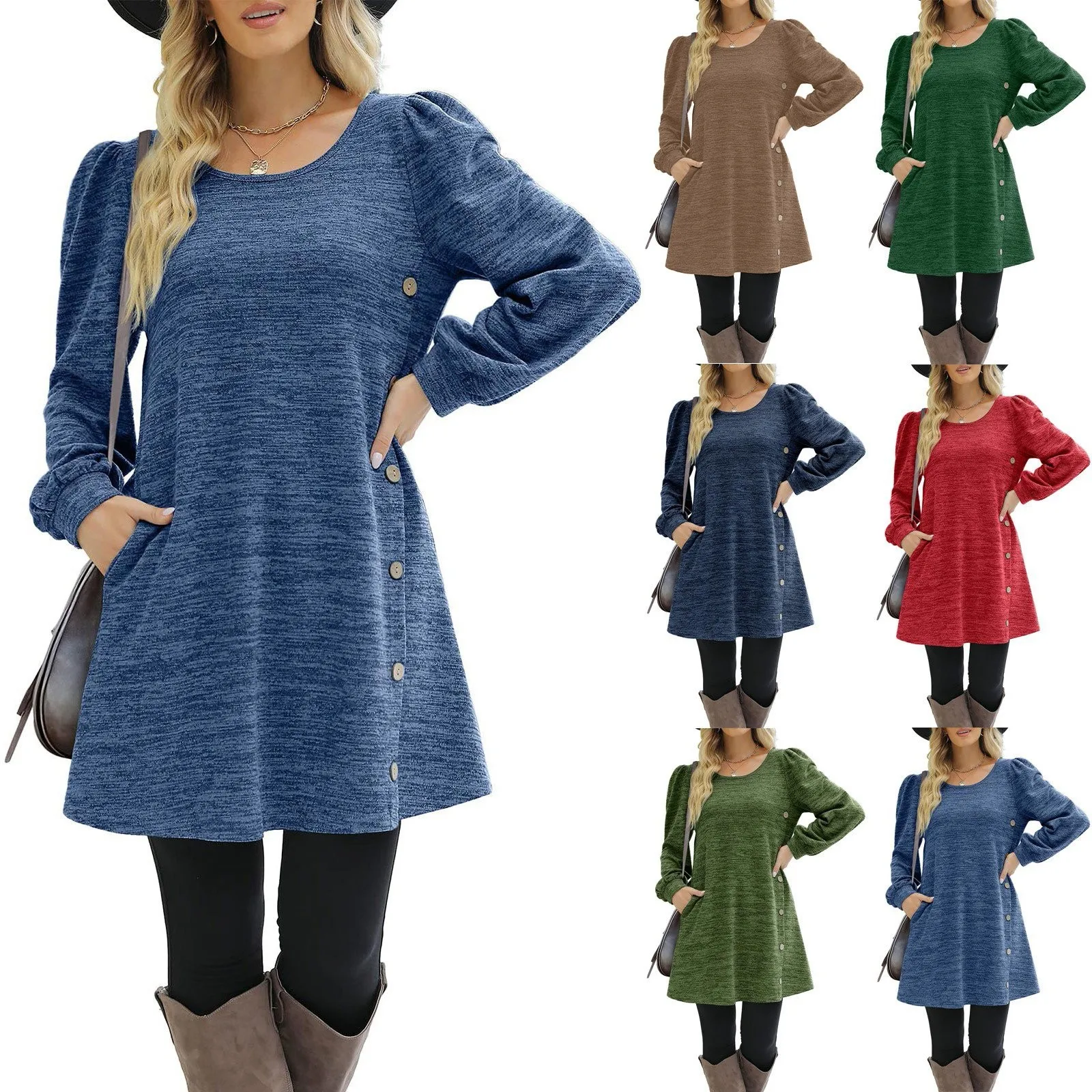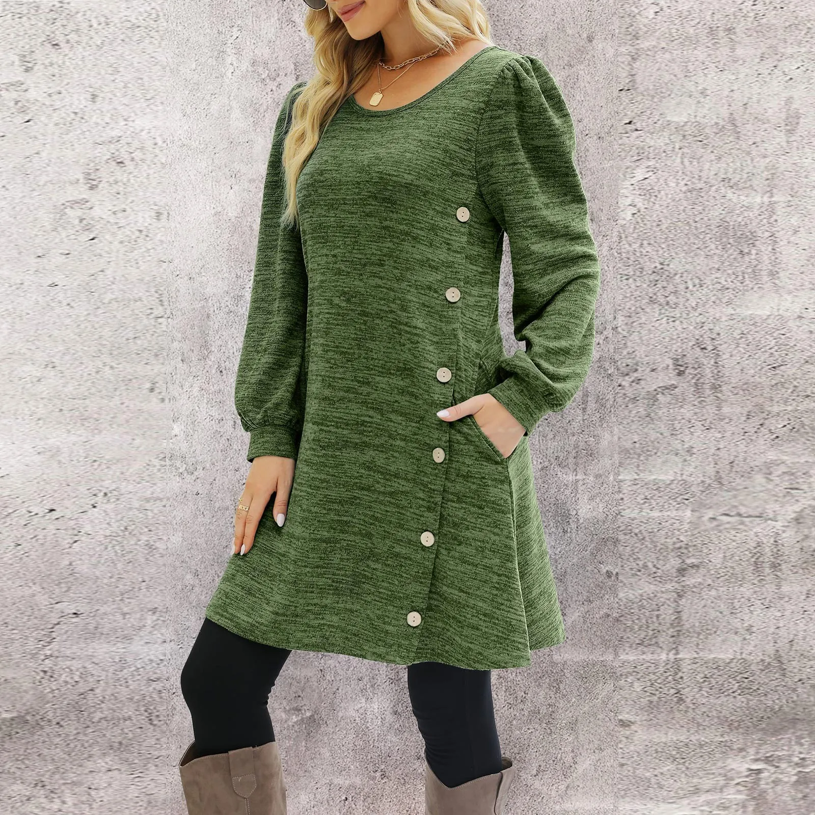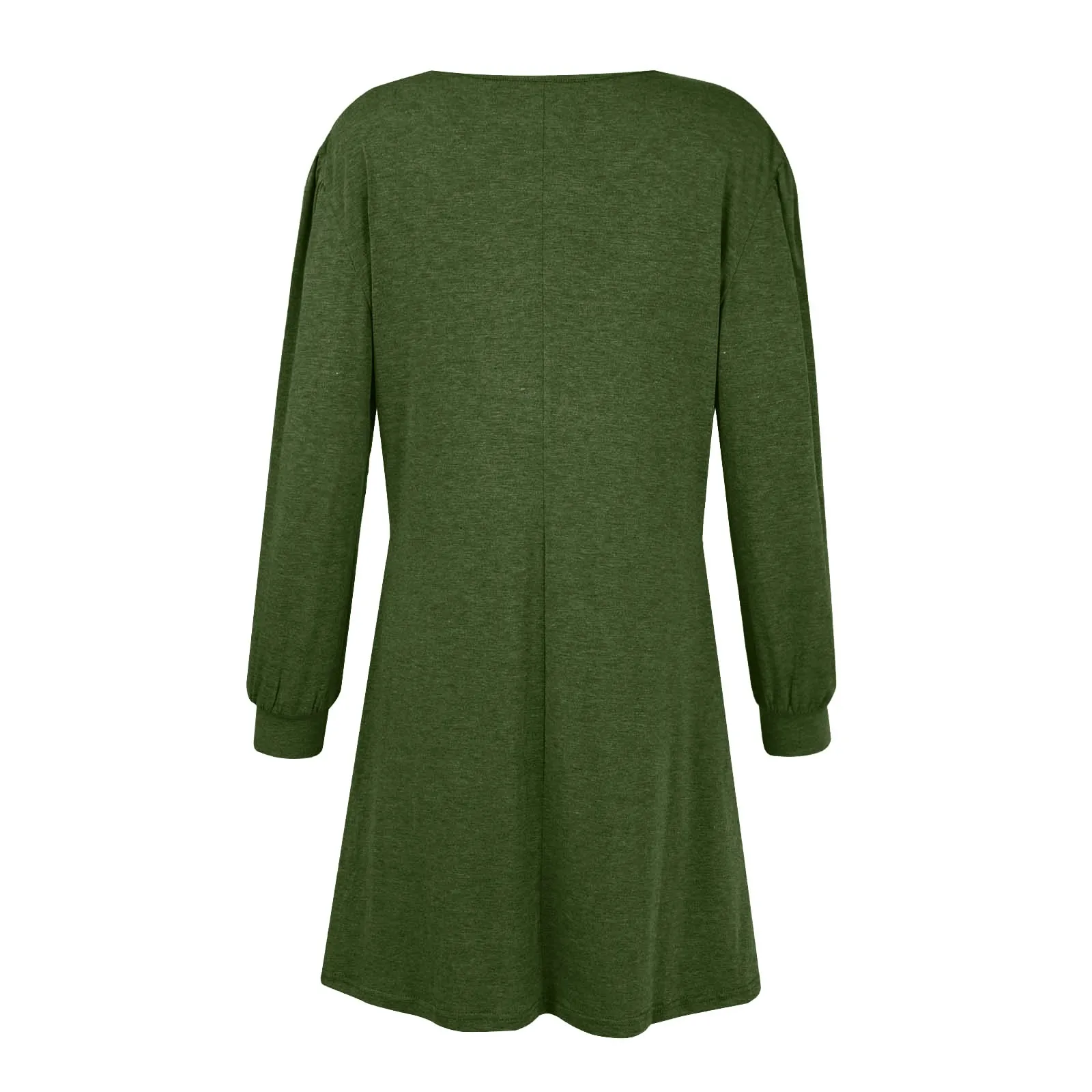 Fashion Women Round Neck Solid Color Button Long Sleeve Casual Loose Dress