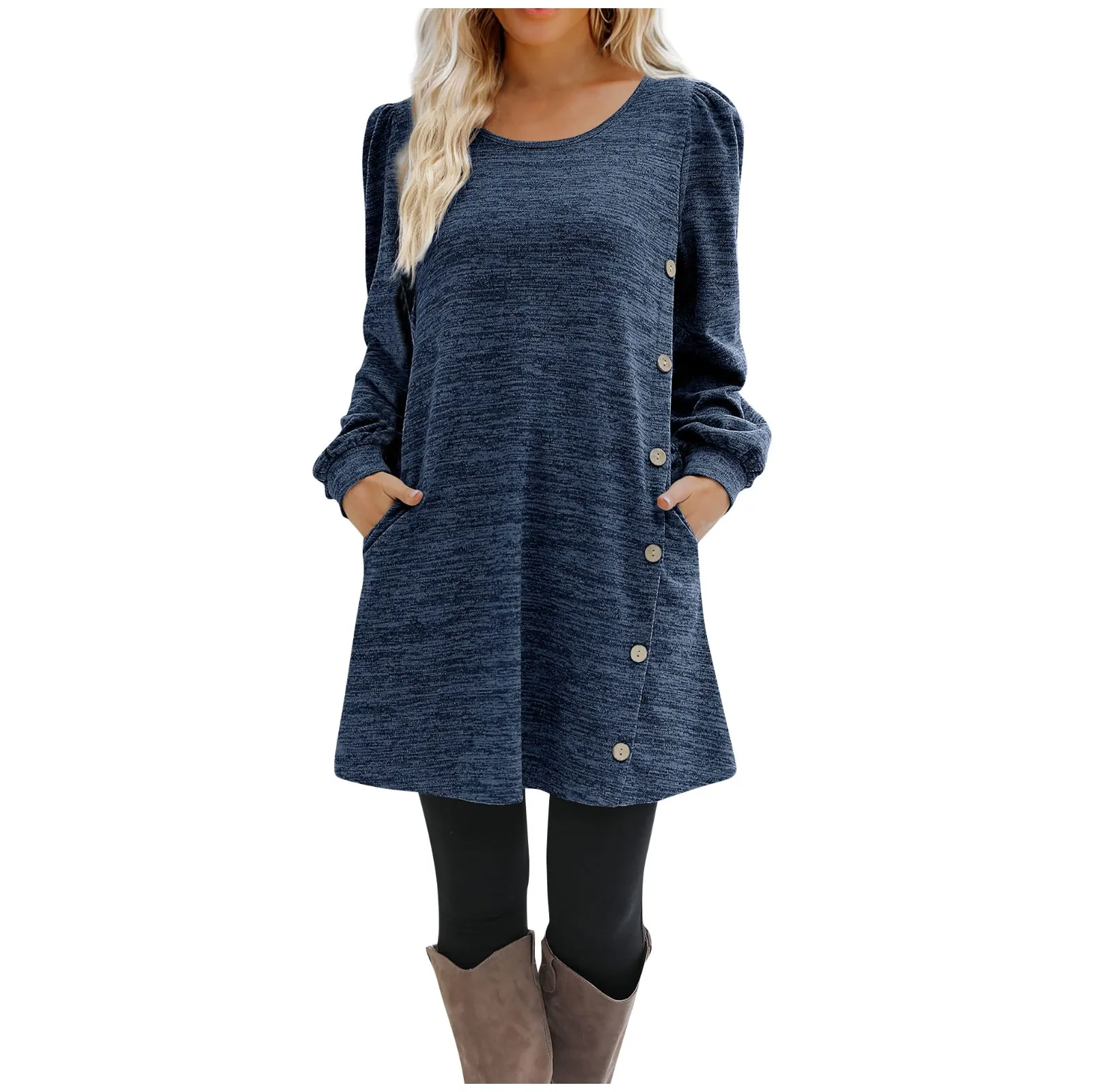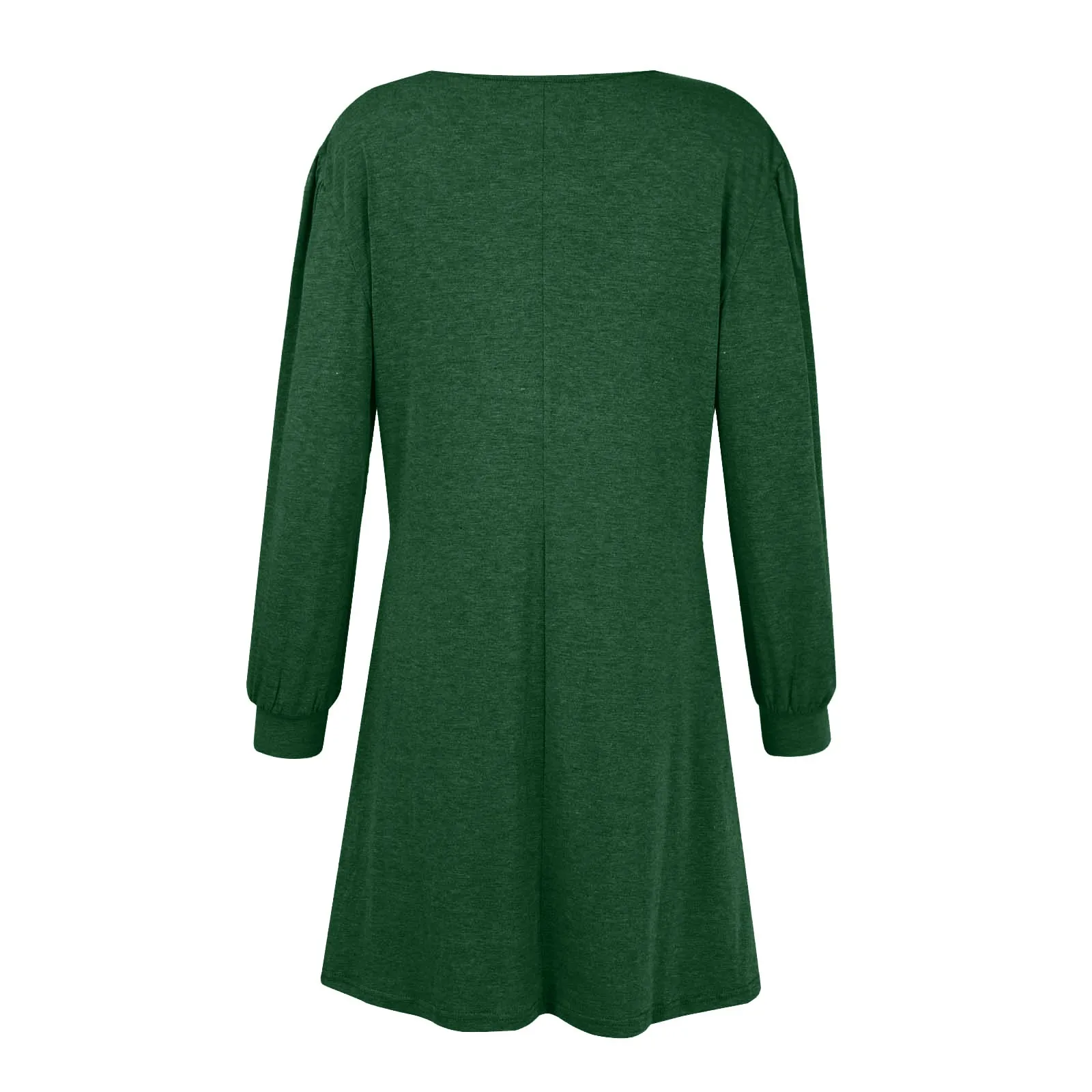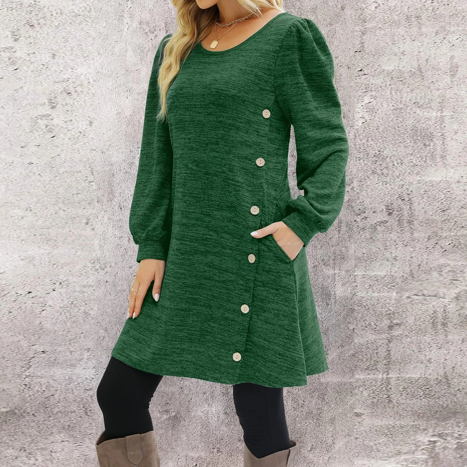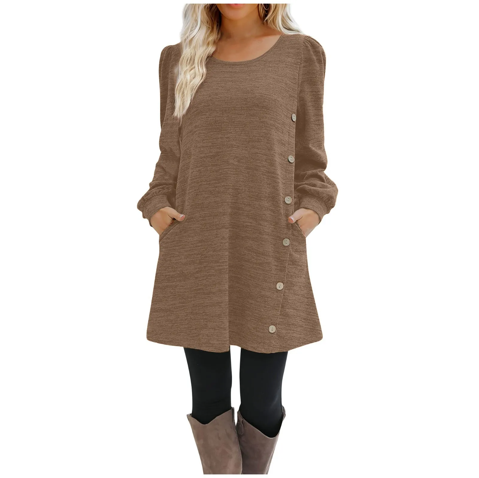Fashion Women Round Neck Solid Color Button Long Sleeve Casual Loose Dress