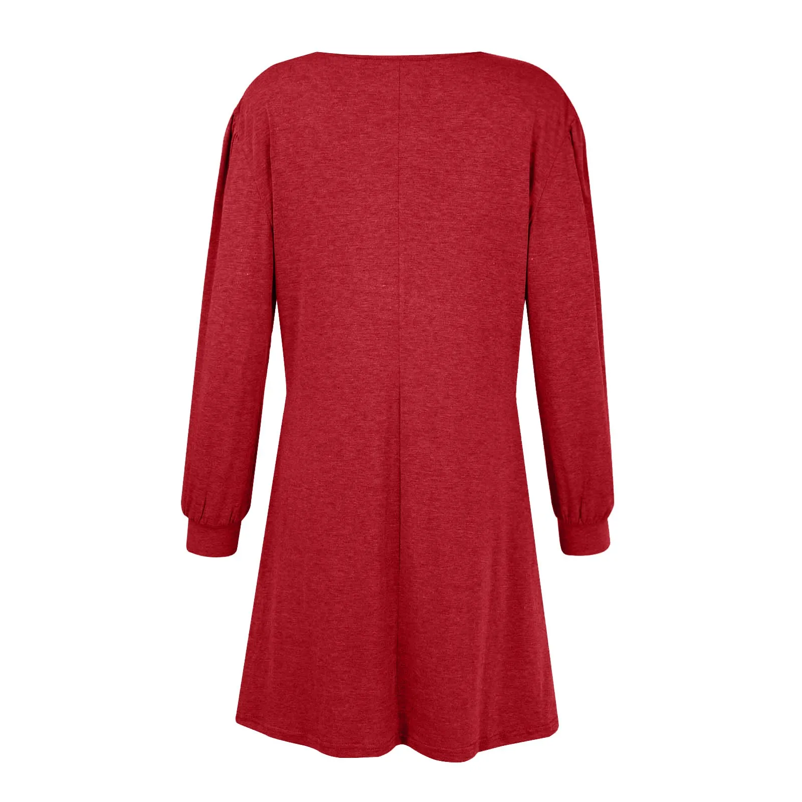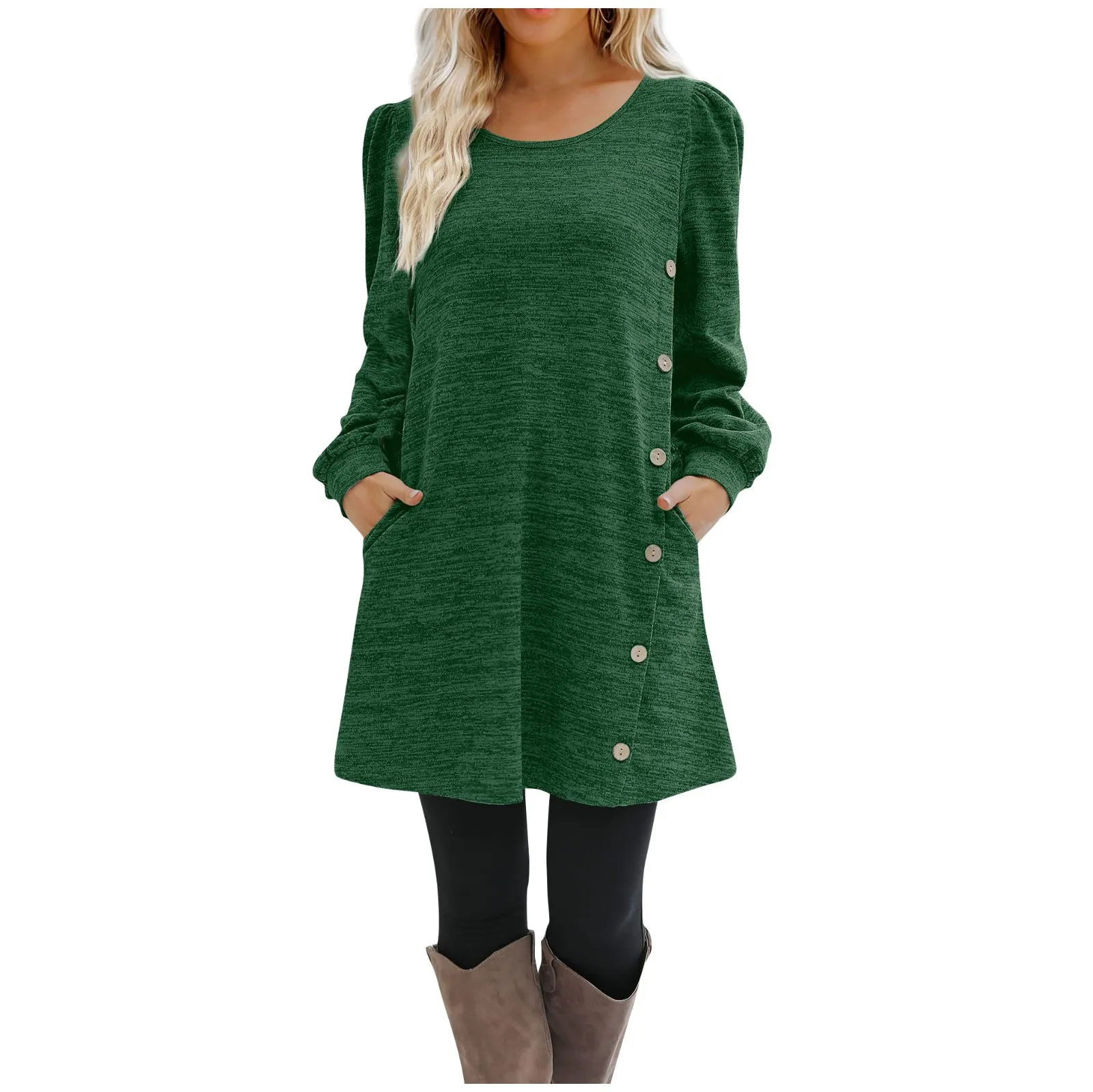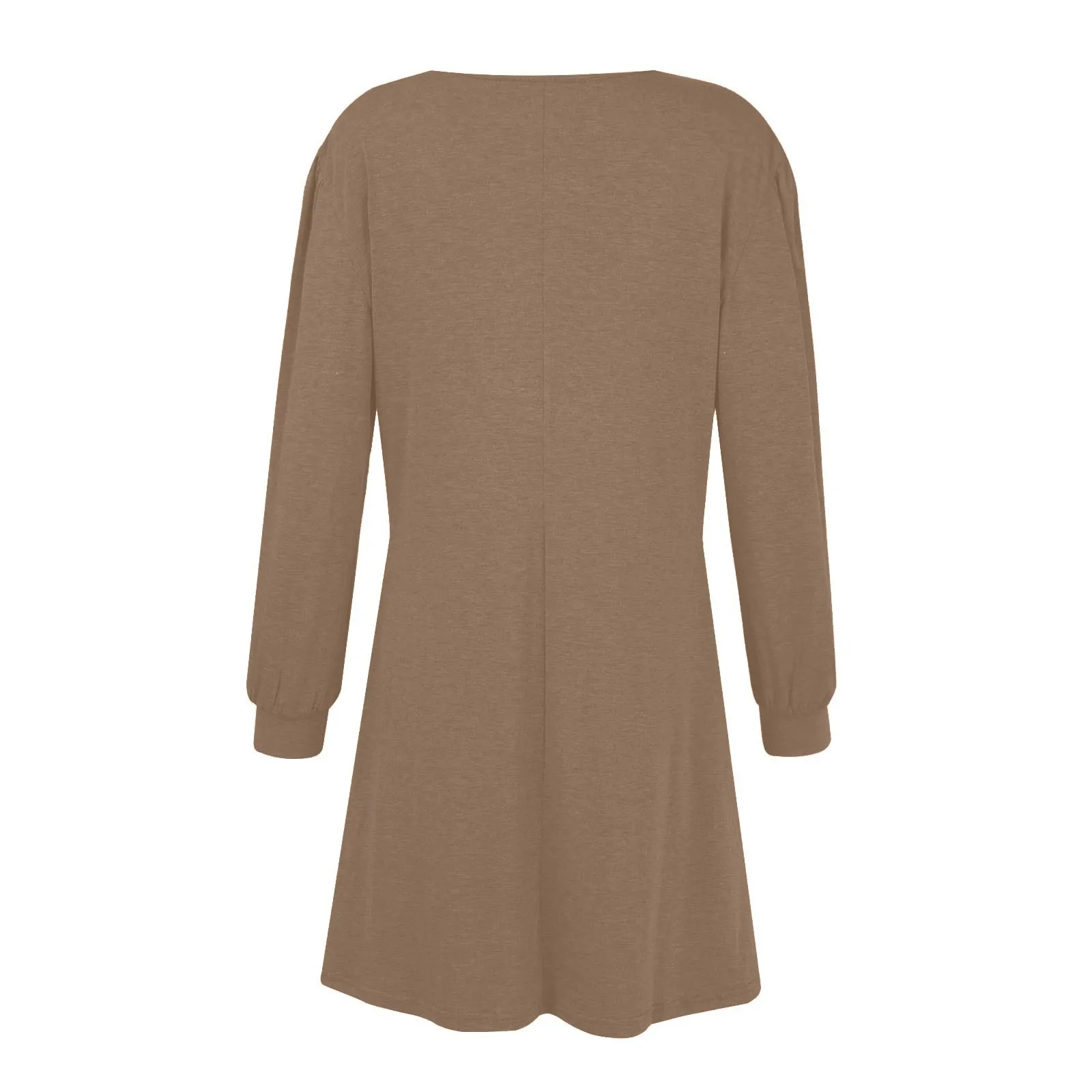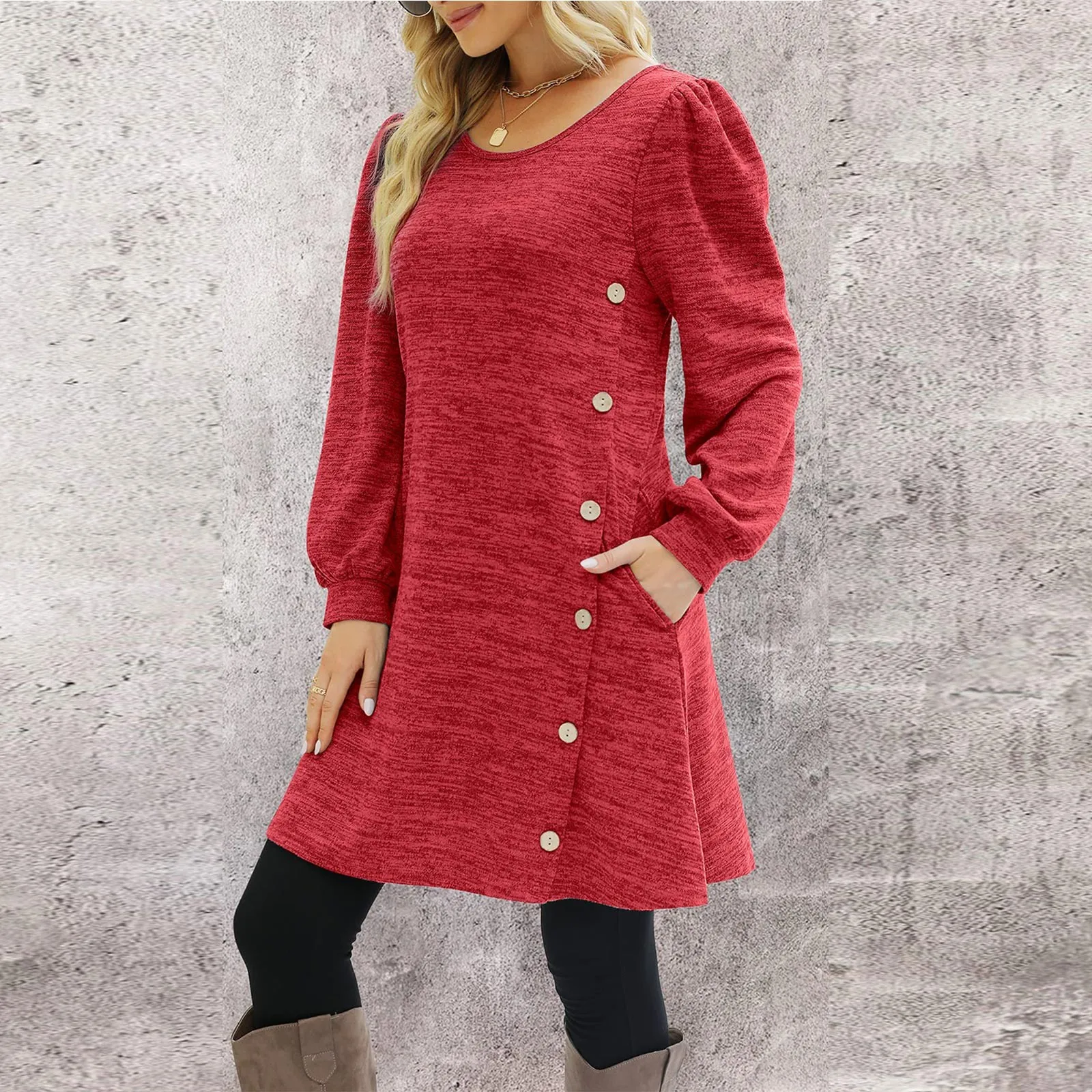 Fashion Women Round Neck Solid Color Button Long Sleeve Casual Loose Dress