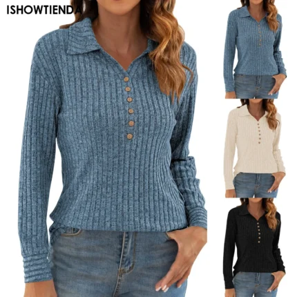 Women Sweater Pullover Basic Lapel Neck Ribbed Tops Solid Knitted Jumper Fall Winter Button Collared Tunic Lightweight Tops