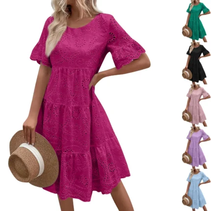 Women’s Boho Style White Dresses Casual Pleated Solid Lace Hollow Dress Short Sleeve Sundress Beach Robe ŠŠ»Š°ŃŃŠµ